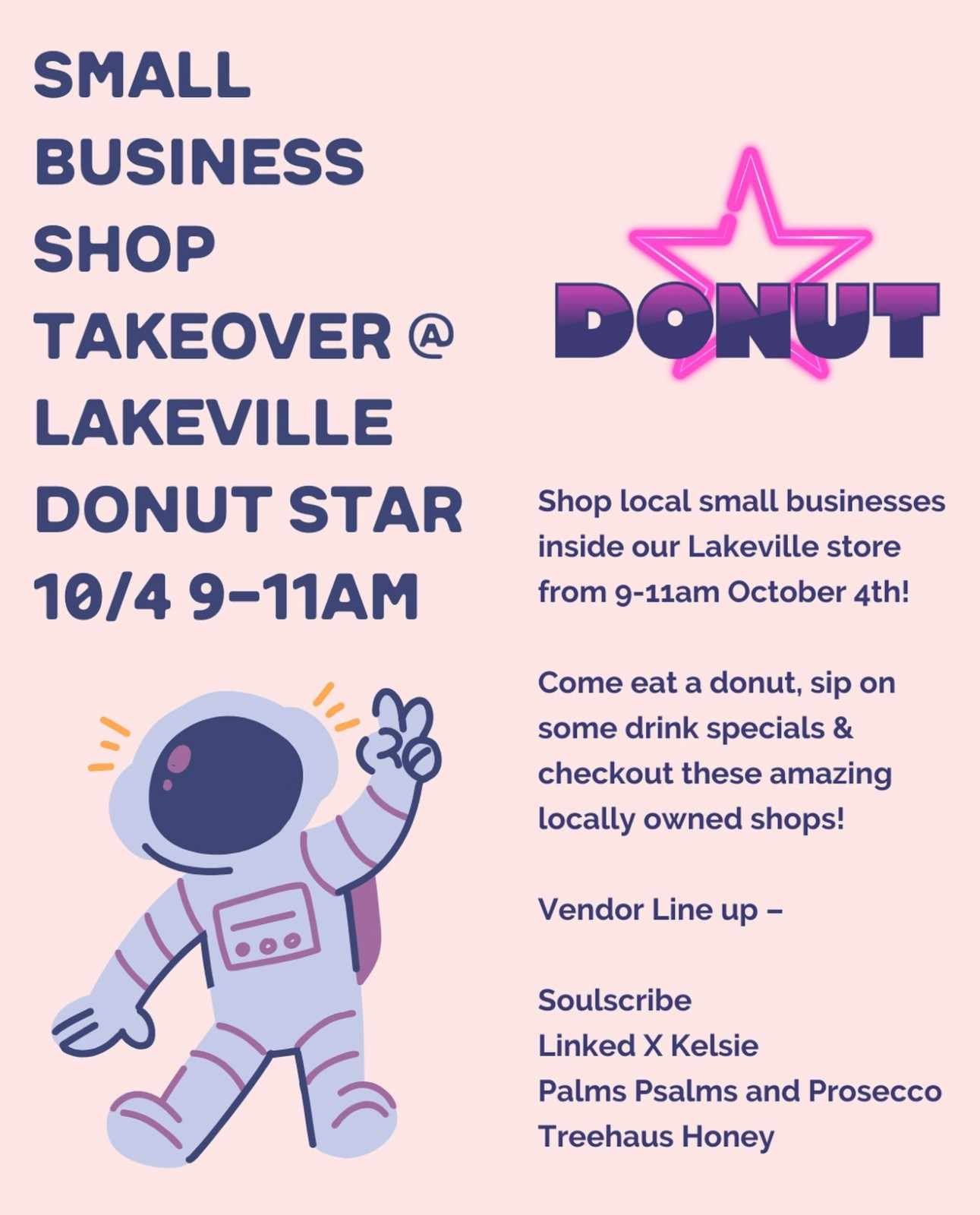 Donuts at Donut Star are handcrafted fresh every morning (and often sell out!). On October 4th the Lakeville location will see a takeover of 4 local businesses. So go try some donuts, grab a coffee/tea, and shop some locally-owned goods!