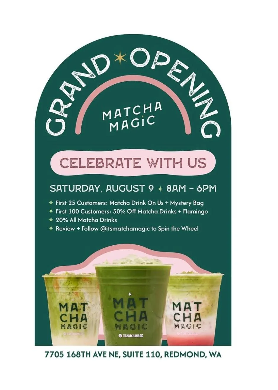 Redmond’s first dedicated matcha café hosts a full-day grand opening with promotions: freebies for early customers, 20–50% drink discounts, prize wheel spins, free macaron with purchase, and other goodies. The first 25 customers will get free matchas!