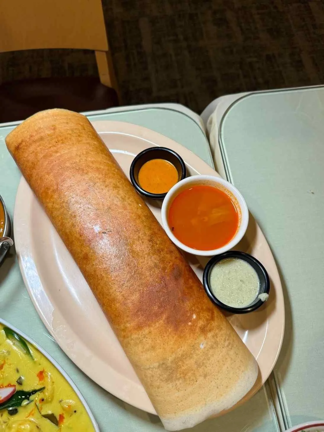 Dosa: A thin, savory crepe with a rich history dating back to the first century. Traditionally served with chutney, sambar, and a spiced potato filling. Yum!