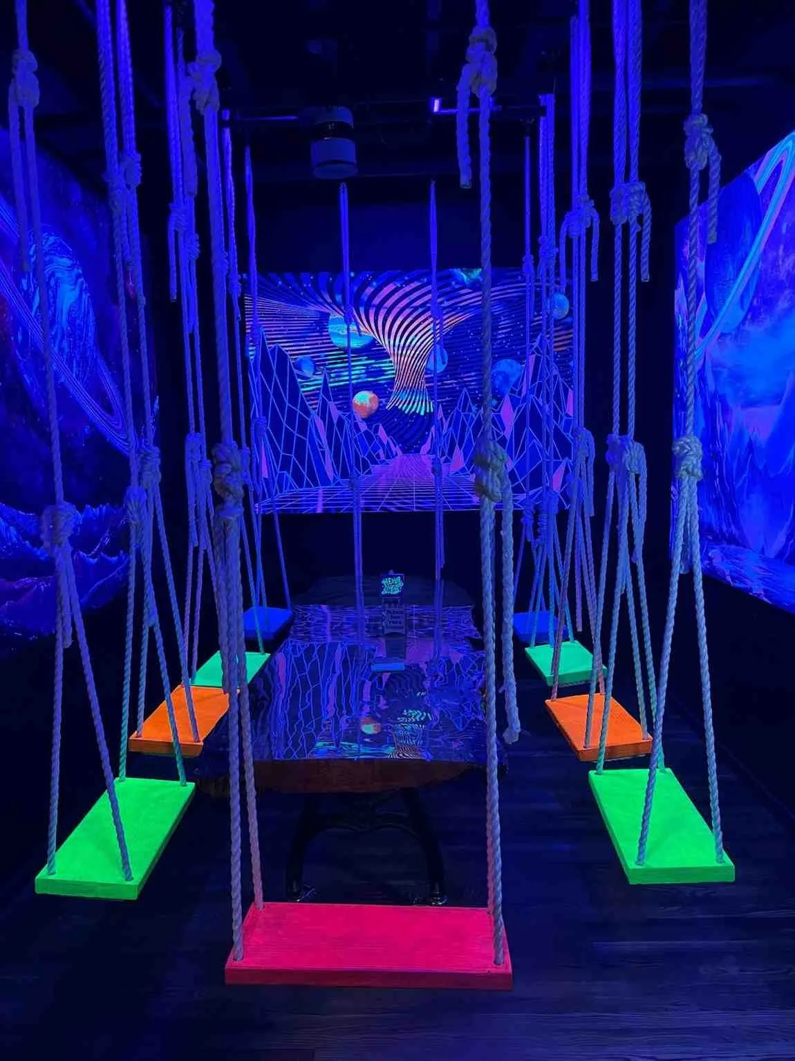 The Glow in the Dark Swing Room (rooms 1 & 3) offers a fun atmosphere where guests can gently swaying on illuminated swings - creating Instagram-worthy moments with every visit.