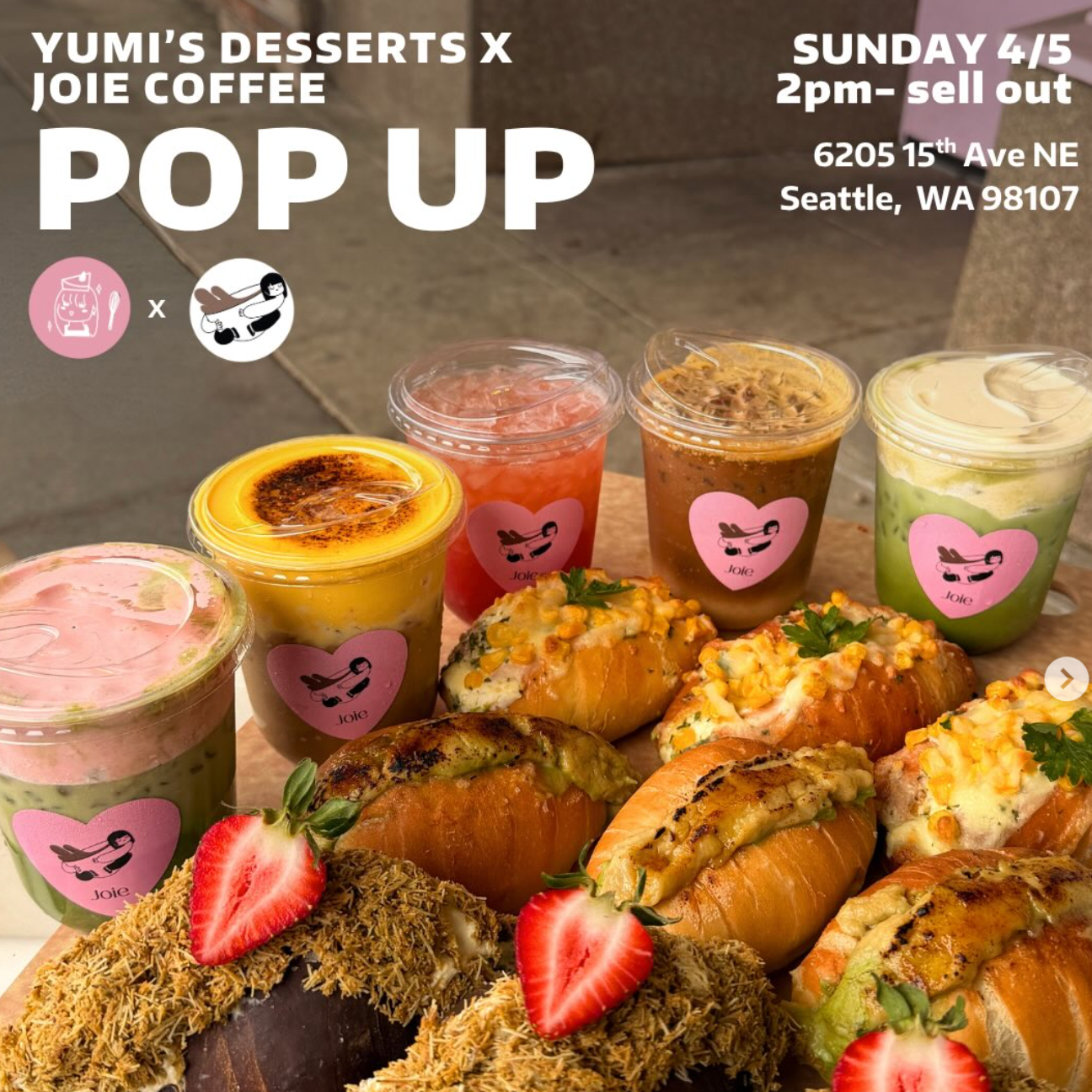On April 5th they're at Joie Coffee in the U District, with a lineup of crowd-favourite flavours including Classic, Dubai Chocolate Strawberry, Banana Matcha Crème Brûlée, and Korean Garlic Corn Cheese. Joie's floral matchas and specialty drinks make for a solid pairing. First come first served, limit two per person, cash or Venmo accepted.